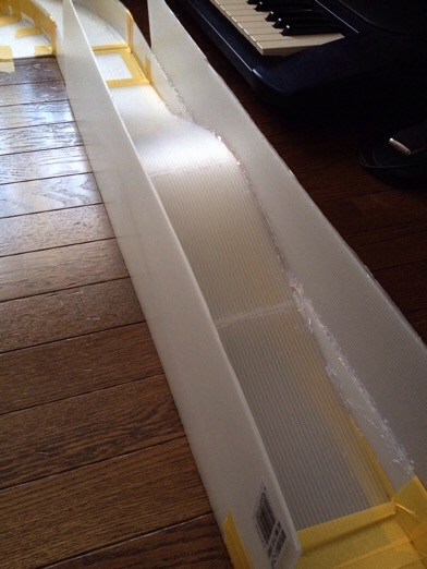 材料は皆さんのマネしてプラダン。ホームセンターで安いです。畳よりちょっと小さいくらいで200円しませんでしたね〜。3枚購入。加工がしやすくて安くてなかなかいい。